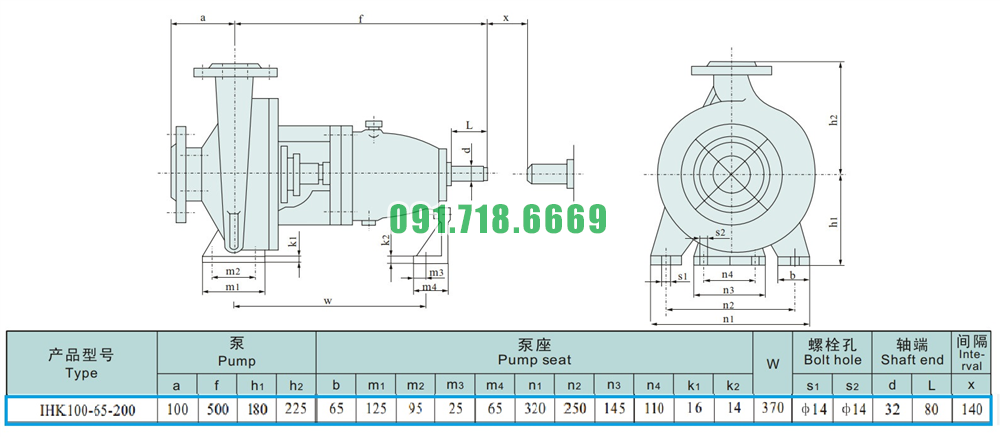 Kích thước của đầu máy bơm nước li tâm cánh hở IHK100-65-200 làm bằng inox
