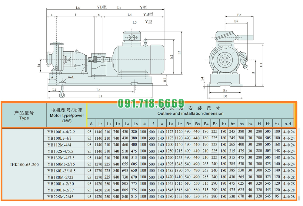 Kích thước lắp đặt của máy bơm nước li tâm cánh hở IHK100-65-200 làm bằng inox