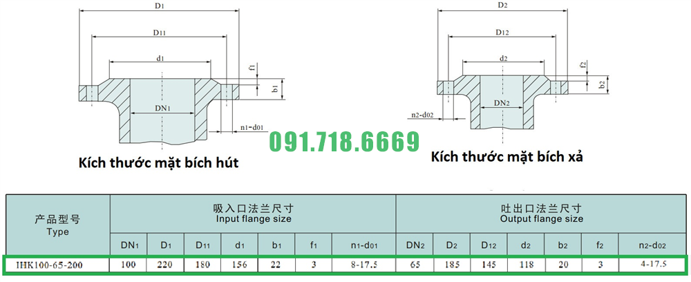 Kích thước mặt bích của máy bơm nước li tâm cánh hở IHK100-65-200 làm bằng inox