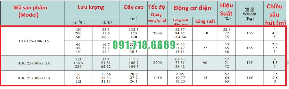 Bảng lưu lượng của máy bơm nước li tâm cánh hở IHK125-100-315 hiệu suất 240 m3/h