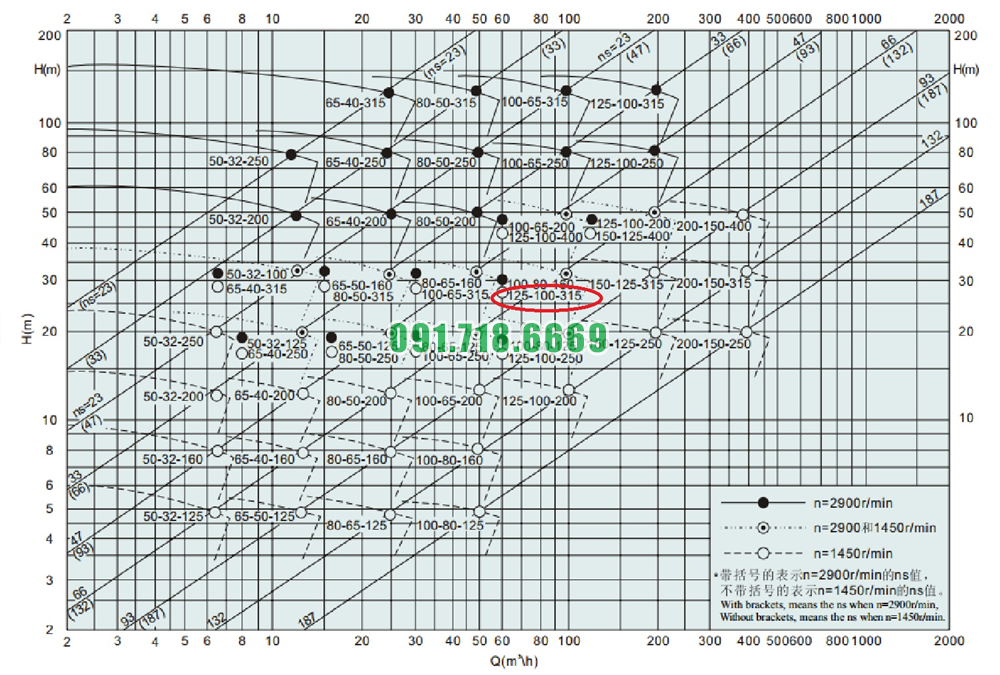 Đường cong hiệu suất của máy bơm nước li tâm cánh hở IHK125-100-315 hiệu suất 240 m3/h