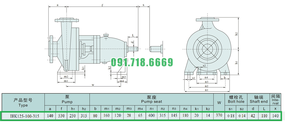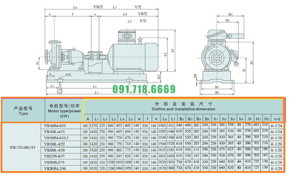 Kích thước của đầu máy bơm nước li tâm cánh hở IHK125-100-315 hiệu suất 240 m3/h