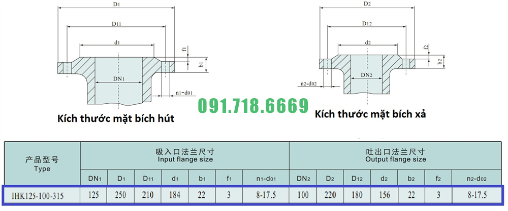 Kích thước mặt bích của máy bơm nước li tâm cánh hở IHK125-100-315 hiệu suất 240 m3/h