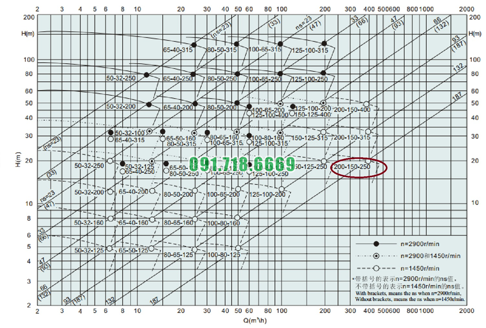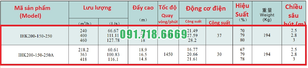 Bảng lưu lượng của máy bơm nước sạch cánh hở IHK200-150-250 đường thoát 150mm