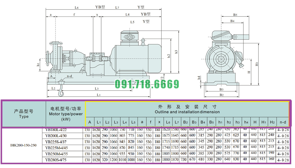 Kích thước lắp đặt của máy bơm nước sạch cánh hở IHK200-150-250 đường thoát 150mm