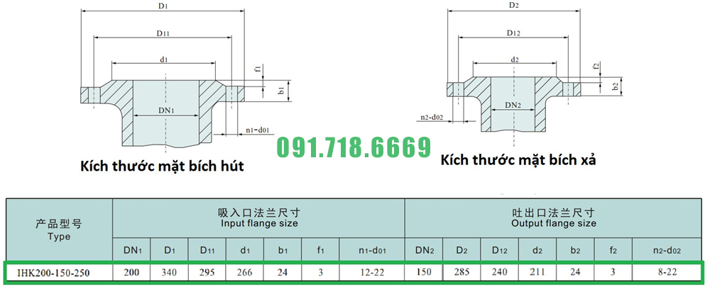 Kích thước mặt bích của máy bơm nước sạch cánh hở IHK200-150-250 đường thoát 150mm