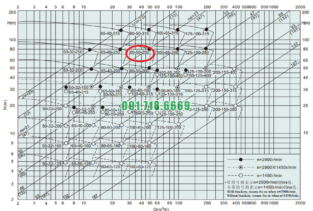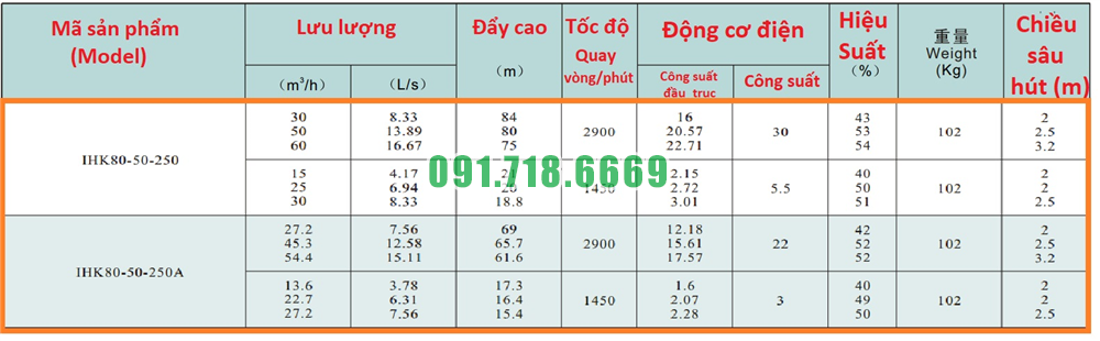 Bảng lưu lượng của máy bơm nước sạch li tâm cánh hở IHK80-50-250