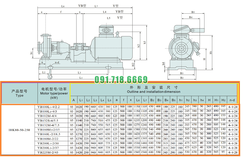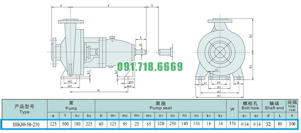 Kích thước của đầu máy bơm nước sạch li tâm cánh hở IHK80-50-250