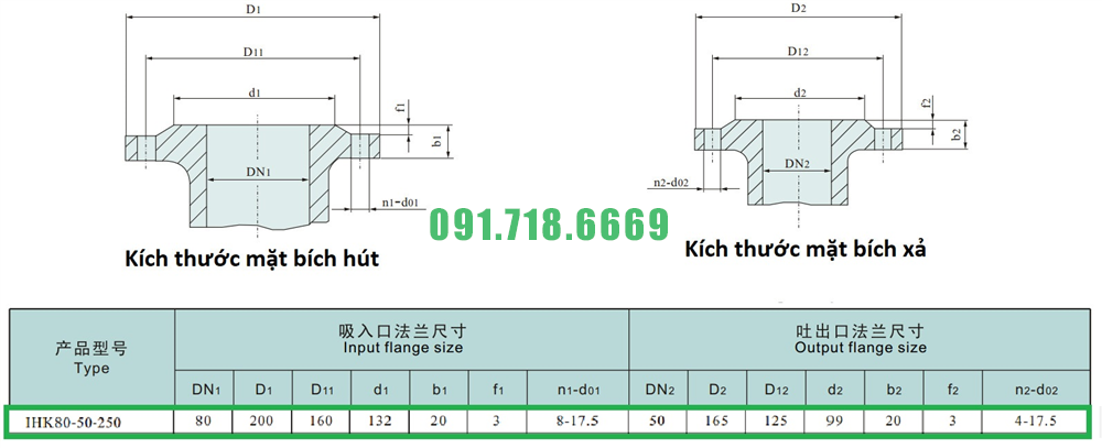 Kích thước mặt bích của máy bơm nước sạch li tâm cánh hở IHK80-50-250