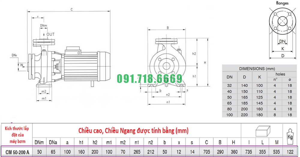 Kích thước máy bơm nước sạch li tâm CM50-250C dòng điện 380v