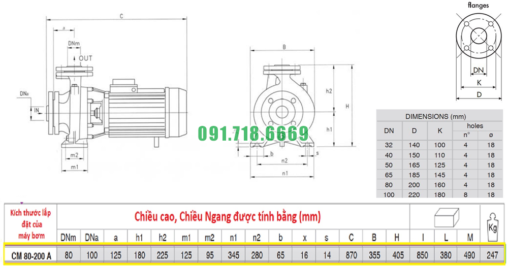 Kích thước máy bơm nước sạch li tâm CM80-200A hiệu suất 240 m3/h