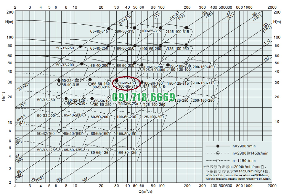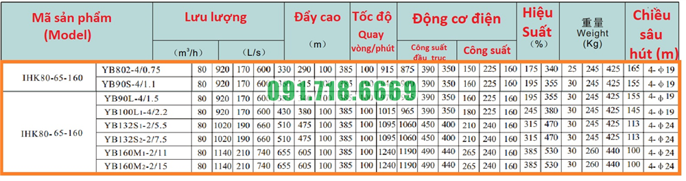 Bảng lưu lượng của bơm li tâm cánh hở lưu lượng 30-60 m3/h model IHK80-65-160