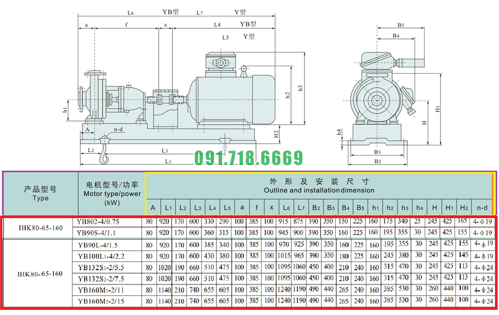Kích thước lắp đặt của bơm li tâm cánh hở lưu lượng 30-60 m3/h model IHK80-65-160