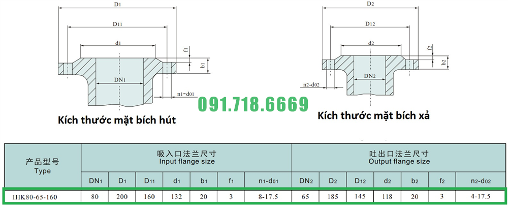 Kích thước mặt bích của bơm li tâm cánh hở lưu lượng 30-60 m3/h model IHK80-65-160