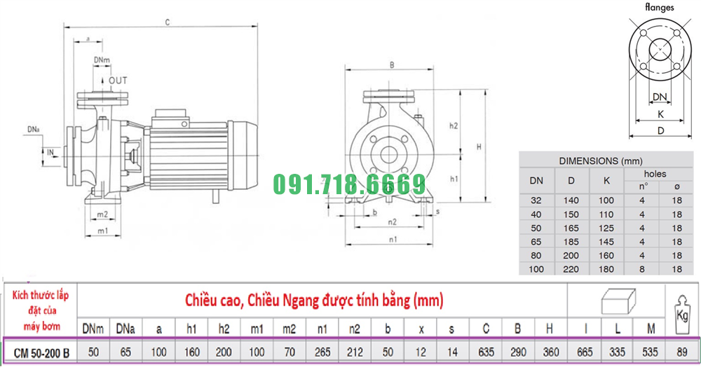 Kích thước bơm li tâm trục ngang công suất 11 kw model CM50-200B