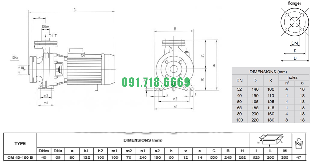 Kích thước bơm li tâm trục ngang công suất 3 kw model CM40-160B