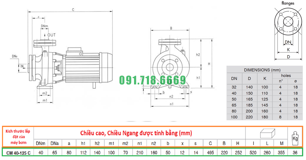Kích thước bơm li tâm trục ngang lưu lượng 30 m3/h model CM40-125C