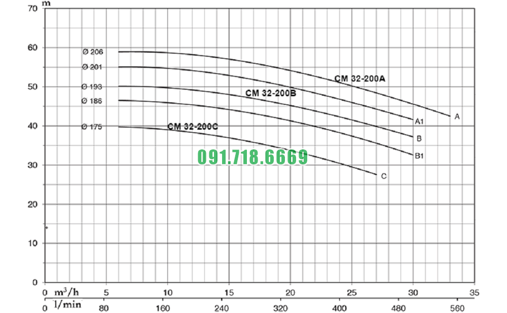 Đường cong hiệu suất bán bơm li tâm trục ngang lưu lượng 36 m3/h model CM32-200B