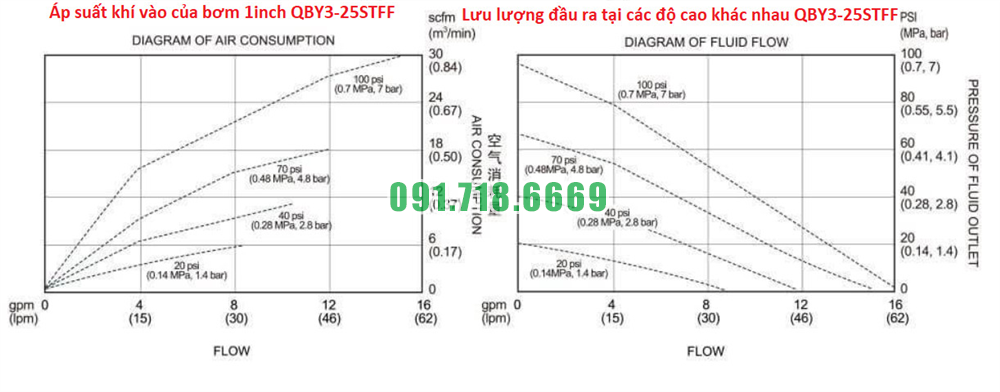 Đường cong hiệu suất của bơm màng khí nén model QBY3-25STFF kích thước hút xả 1 inch