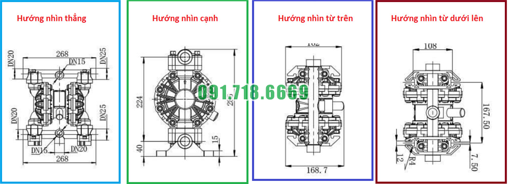 Bản vẽ kích thước của bơm màng khí nén model QBY3-25STFF kích thước hút xả 1 inch
