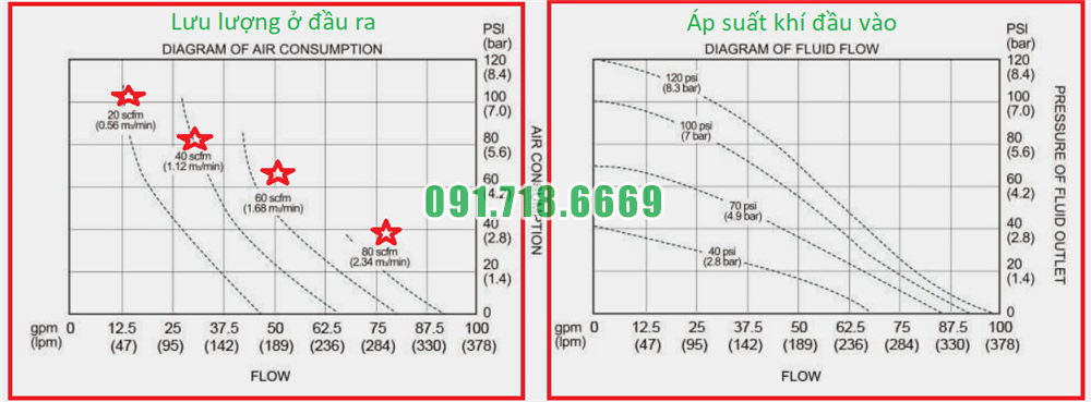 Đường cong hiệu suất bơm màng khí nén model QBY3-50STFF lưu lượng max 22.6 m3/h