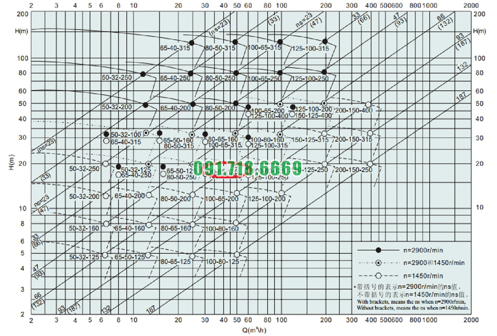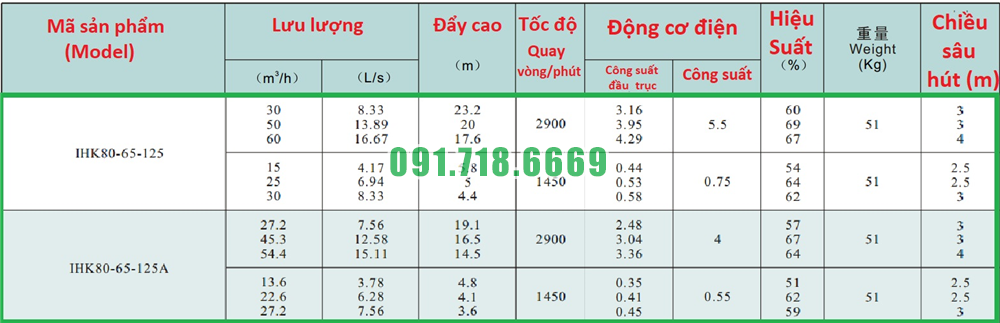 Bảng lưu lượng của máy bơm cánh hở li tâm trục ngang IHK80-65-125 lưu lượng 60 m3/h
