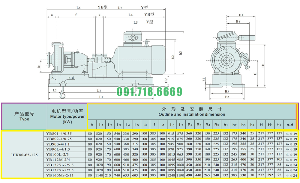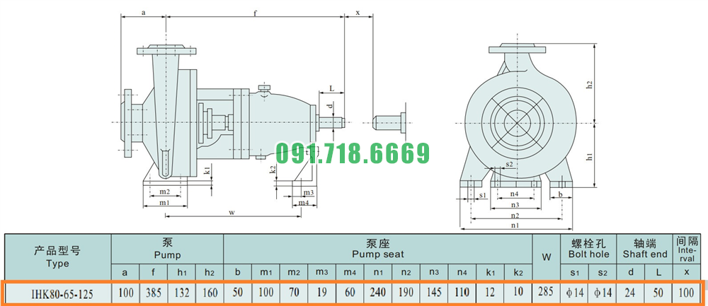 Kích thước của đầu máy bơm cánh hở li tâm trục ngang IHK80-65-125 lưu lượng 60 m3/h