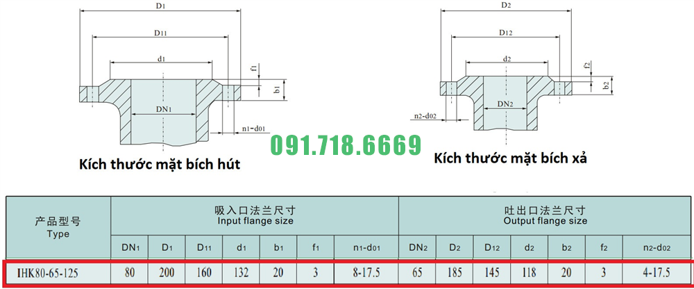 Kích thước mặt bích của máy bơm cánh hở li tâm trục ngang IHK80-65-125 lưu lượng 60 m3/h