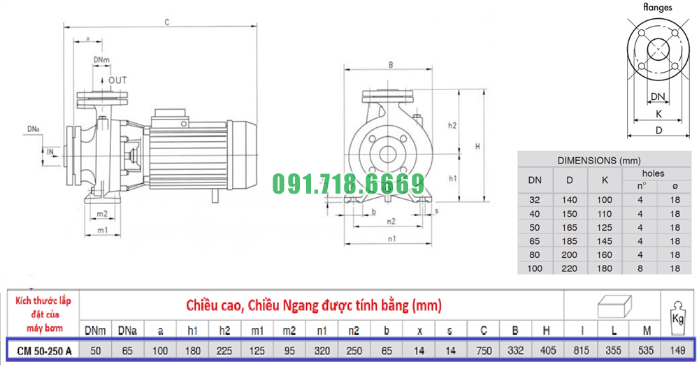Thông số kỹ thuật máy bơm nước sạch li tâm trục ngang CM50-250A kích thước 40 mm