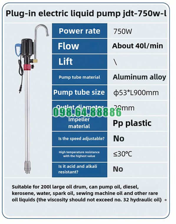 Thông số Máy bơm điện hút thùng phuy vỏ nhôm JDT-750W-L