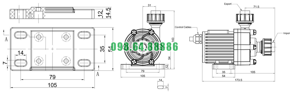Cấu tạo và kích thước bản vẽ máy bơm hóa chất ly tâm TDM-550PERU-DC48-DC hiệu suất 76L/m