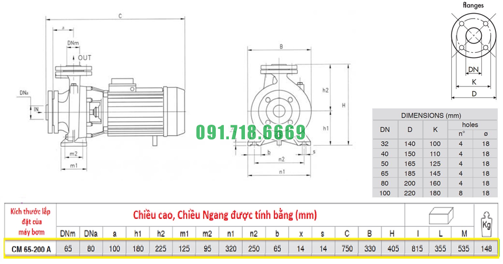 Kích thước máy bơm nước li tâm trục ngang CM65-200A động cơ điện 22 kw