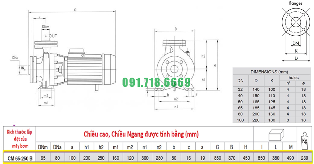 Kích thước máy bơm nước li tâm trục ngang CM65-250B có điện áp 380v
