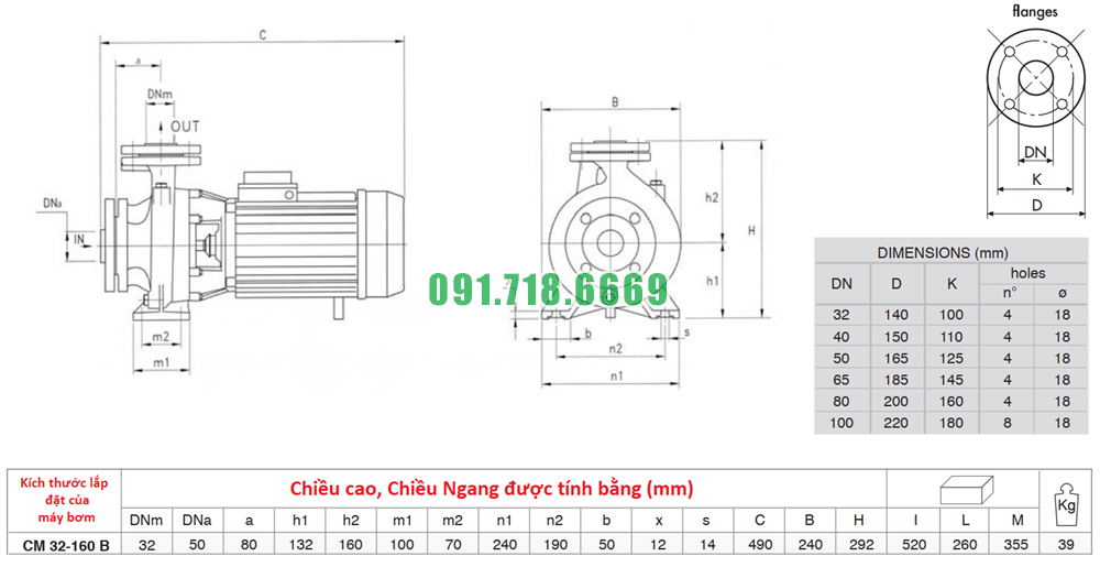 Kích thước máy bơm nước sạch li tâm trục ngang CM32-160B đường kính DN50