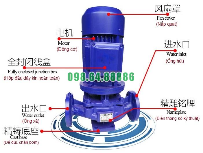 Máy cấp nước trục đứng, bơm đường ống, bơm ly tâm trục đứng ISG65-160B, IRG65-160B, 3kw